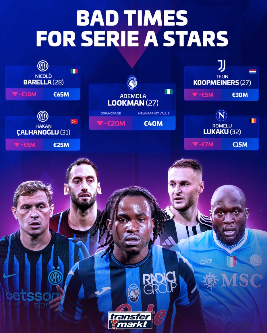 北京时间10月7日,在更新了意甲球员的身价之后,德转同步统计出了此次身价跌幅最显著的10名球员,其中卢克曼以2000万欧元的跌幅居首,而劳塔罗、巴雷拉、迪马尔科、弗拉霍维奇以及恩昆库则均出现了1000万欧元的身价下滑。德转更新后意甲球员身价跌幅对比Top20:1.卢克曼(亚特兰大)-跌幅2000万欧元(原身价4000万欧元,现身价大幅下降)2.劳塔罗(国际米兰)-跌幅1000万欧元(原身价8500